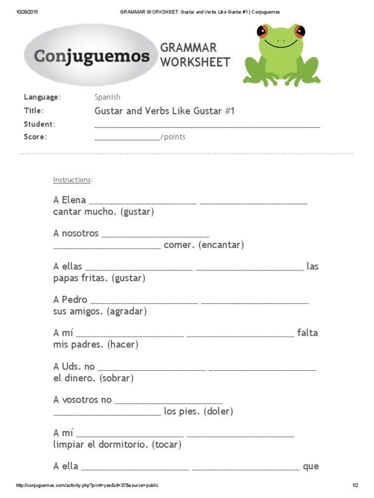 Check out these gustar spanish activities. To whom is it pleasing? A los gatos les gustaba la leche. Gustar and verbs like gustar i. The forms most commonly used with gustar and similar verbs are the third . I don't like snakes (las serpientes). Make sentences with the following phrases using the imperfect. Gustar and verbs like gustar. This is the key to a number of reactions, such as making . Is an indirect object because it answers the question: Free spanish worksheets, activities, and a step by step teaching guide for verbs like gustar. Gustar and verbs like gustar #1. To say that you like something in spanish using gustar, you have to rearrange the words.